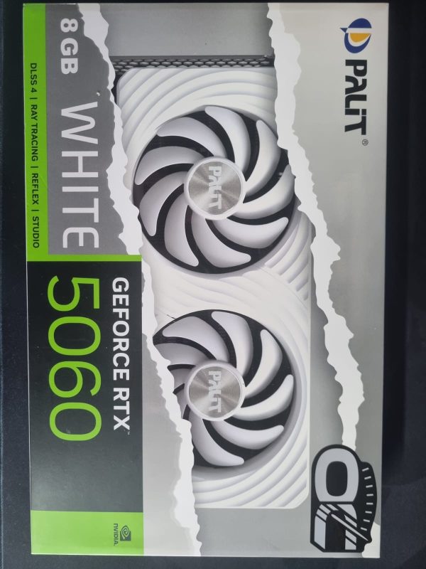 Pre-owned Palit GeForce RTX 5060 White OC with 8GB GDDR7 memory. Features factory overclock, ray tracing, DLSS support, and dual-fan cooling. Includes original packaging.